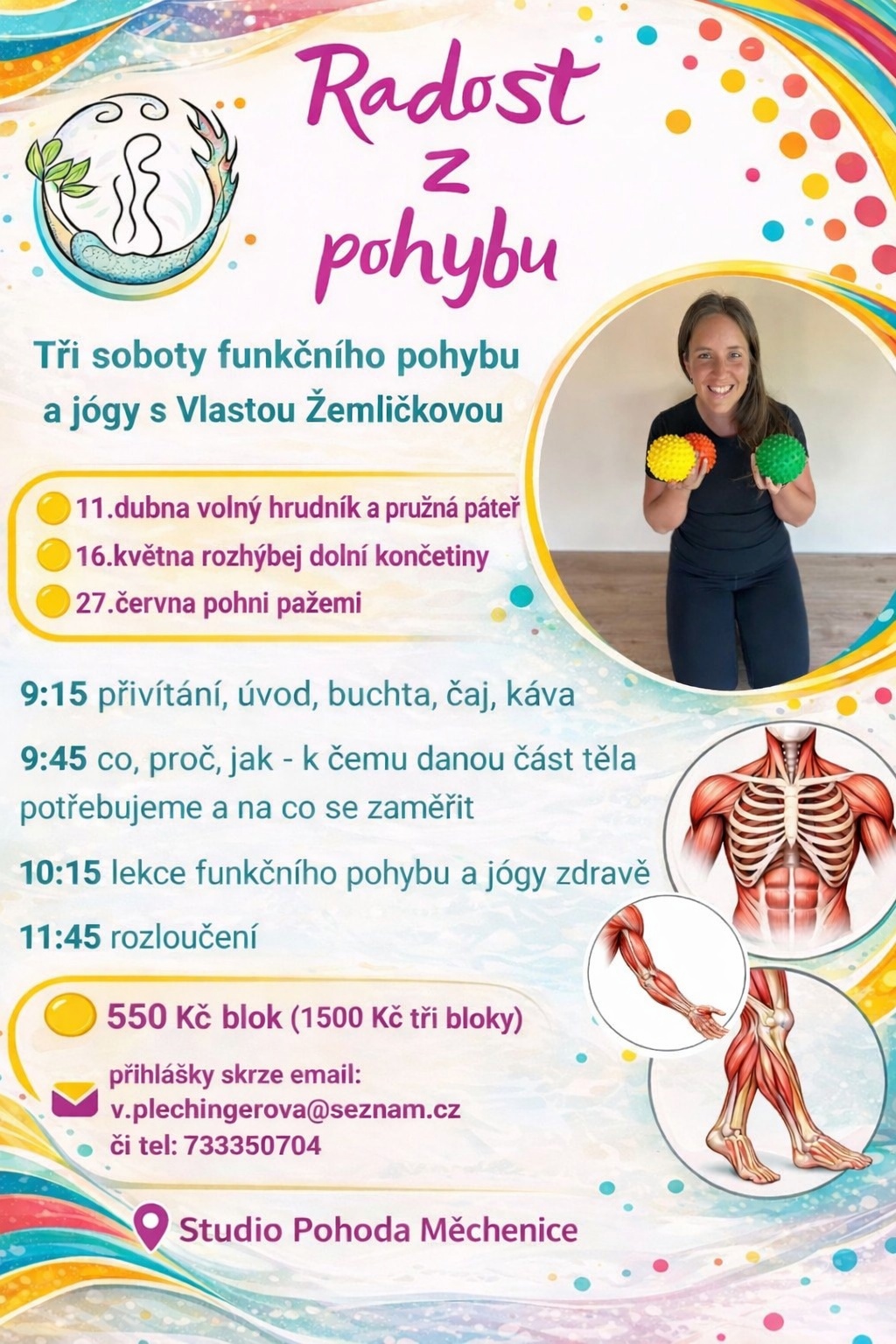 3 soboty funkčního pohybu a jógy s Vlastou Žemličkovou. Jedná se o ucelené bloky zaměřené vždy na konkrétní část těla. Podrobné informace ZDE
